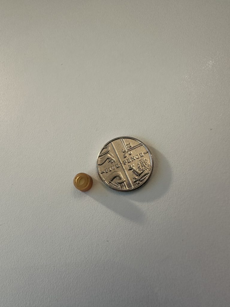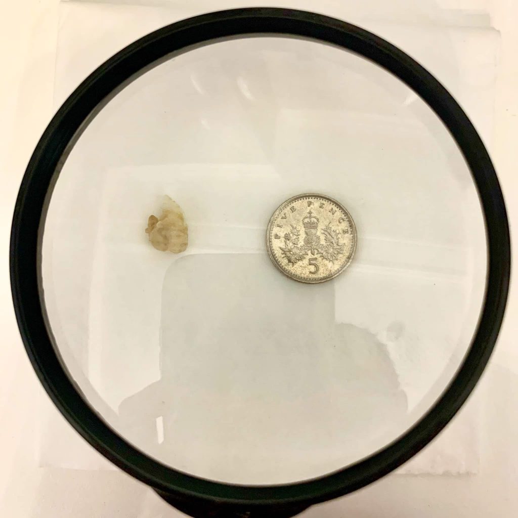 NOT to be confused with Gromit, the cheese loving cartoon. A grommet is a small tube (1.5-2mm in size) and its purpose is to drain fluid away and keep the eardrum open. Fluid behind the ear or ‘glue ear’ is common in young children and needs treating if it is causing problems with hearing or speech or causing lots of ear infections. The grommet usually falls out naturally once the ear is better. In this young client’s case the grommet had not naturally fallen out of the ear. During a routine ear wax removal appointment the old grommet came out of the ear canal along with the ear wax. (No 5p for reference here but it is TINY.) Since finding this grommet, we’ve safely removed half a dozen more!